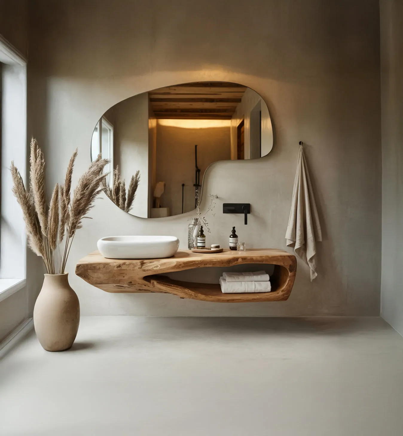 Styling is flexible. Pair with a round or oval vessel and a wall-mounted spout for maximum counter depth, or set a tall single-hole tap on the top if that suits your layout. Natural plaster, textured tile, or limewash all complement the organic edge, while matte metal fittings keep the look relaxed.