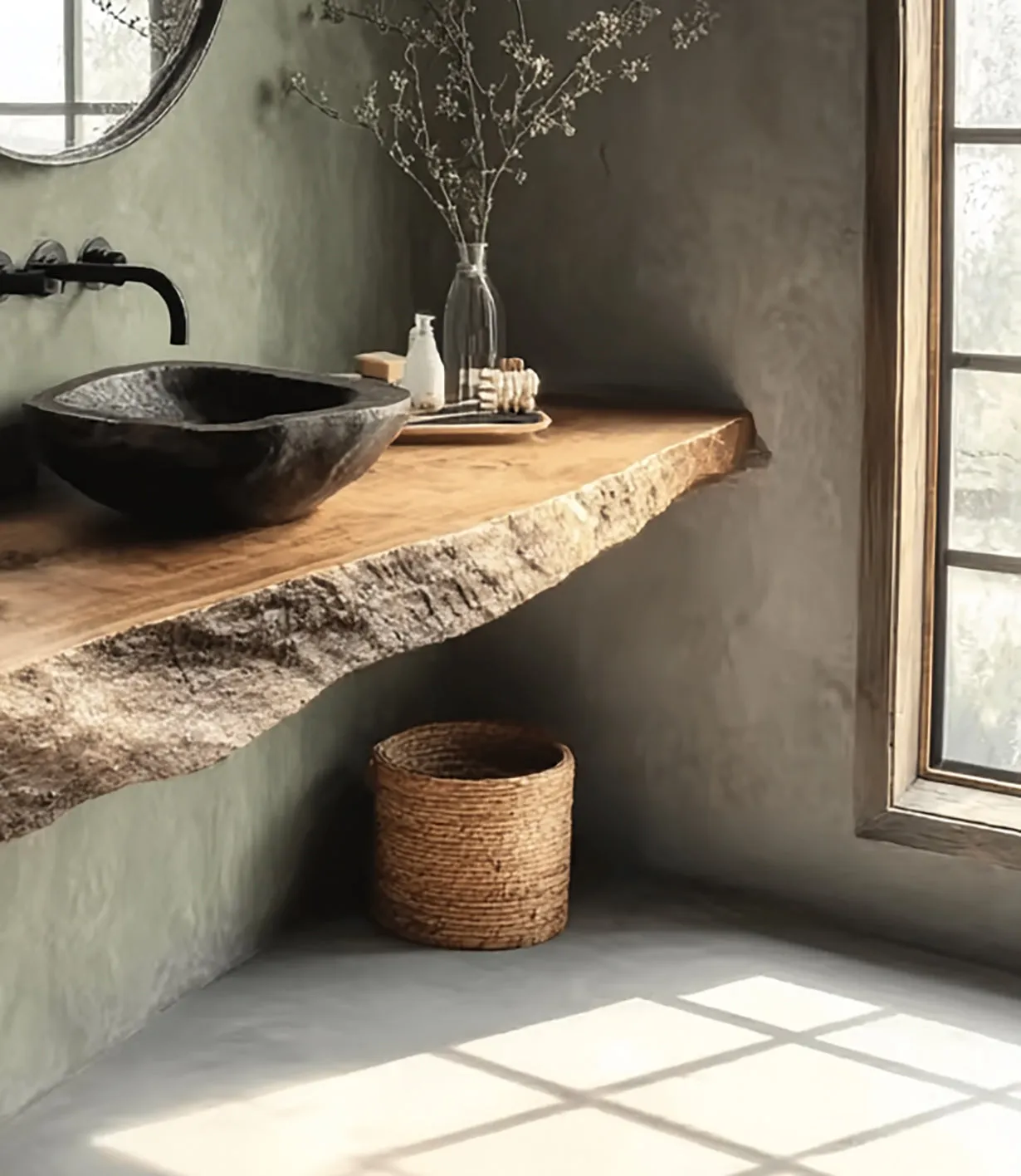 Design it into your scheme as needed. Beneath a mirror it becomes a practical landing spot for daily items; paired with stone or limewash, it reads relaxed and natural. The live edge keeps the line from feeling stiff, while the overall profile stays slim so small rooms do not feel crowded.
